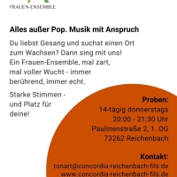 Uns interessieren Chorwerke von der Renaissance bis zur Moderne, volkstümliche und geistliche Chormusik, sowie Werke aus Oper, Operette und Musical bis hin zu Chansons. Sehr offen sind wir darüber hinaus aber auch für Titel, die starke Frauen thematisieren, wie Gabriella’s Song und eben alles was Frauen so interessiert. Legst du auch viel Wert auf individuelle Stimmbildung, persönliche Weiterentwicklung und eine positive Atmosphäre? Dann bist du bei uns genau richtig. Komm und sing mit uns! Nähere Informationen bei unserer Chorsprecherin Tanja Deuscher-Nitsche per Mail unter frauenensemble@concordia-reichenbach-fils.de